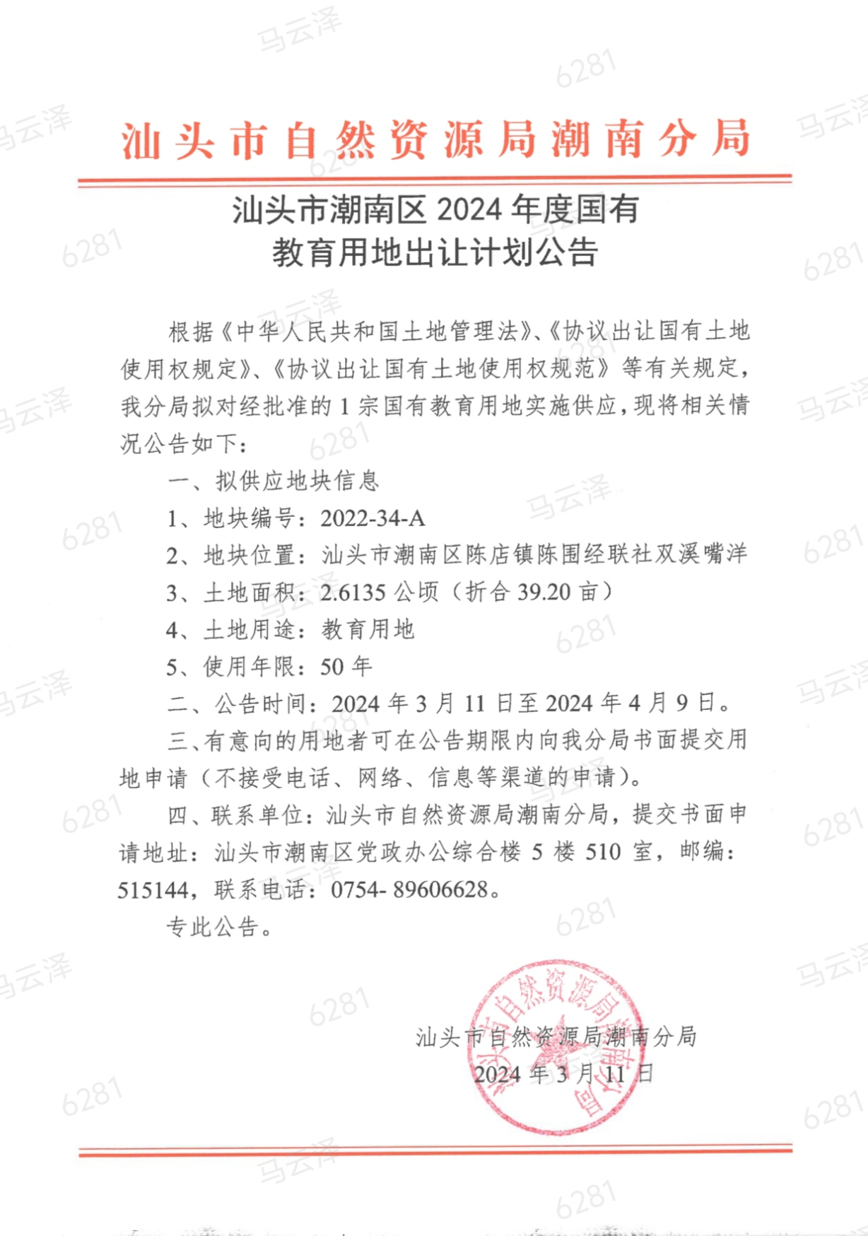 汕头市潮南区2024年度国有教育用地出让计划公告