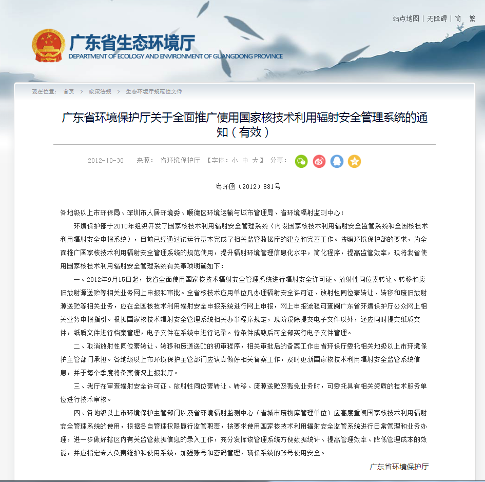 广东省环境保护厅关于全面推广使用国家核技术利用辐射安全管理系统的通知