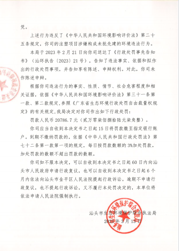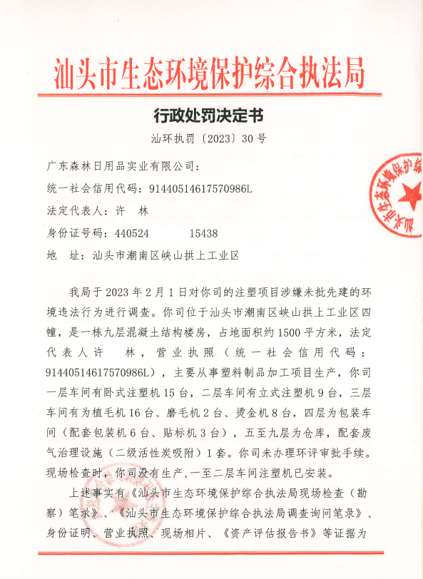 行政处罚决定书(汕环执罚〔2023〕30号)