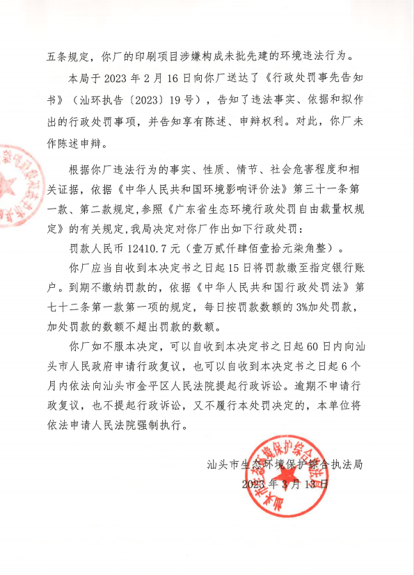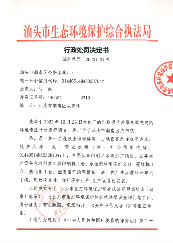 行政处罚决定书(汕环执罚〔2023〕31号)