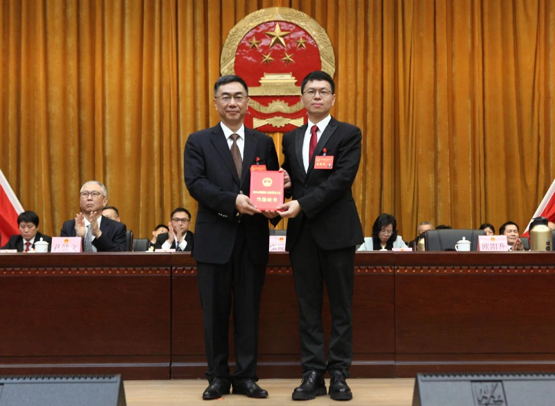 区委书记张晓铿为新当选的潮南区第五届人民代表大会常务委员会主任欧阳升颁发当选证书;随后,新当选的区人大常委会主任欧阳升为潮南区第五届人民代表大会常务委员会副主任古松弟,区人大常委会委员,潮南区人民政府副区长吴海璇、潮南区监察委员会主任陈健颁发当选证书。