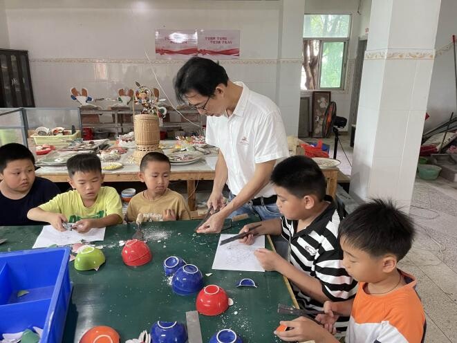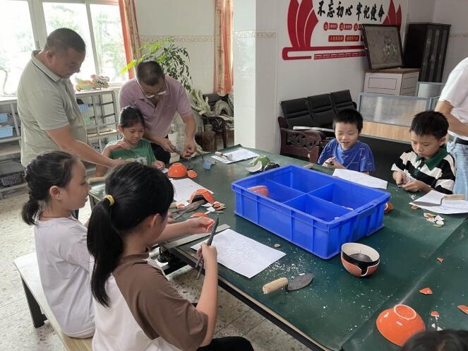 大寮嵌瓷已有100多年的历史,是以各色瓷片为主材,以历史和民间故事、人物、花鸟虫鱼为主题,融绘画、雕塑于一体的潮汕民间建筑装饰工艺,具有取材广泛、造型生动、色彩鲜艳等特点。活动还邀请了汕头市非物质文化遗产项目《大寮嵌瓷》的代表性传承人许少鹏老师为学生开展一场国家级非物质文化遗产嵌瓷主题手工体验课。课中,许少鹏老师向学生们介绍了大寮嵌瓷的历史发展,并带领学生参观了工艺社,体验了嵌瓷的制作,并在旁细心地指导并解答学生在制作时的疑问,让学生们更加深刻地体验了嵌瓷的制作过程,同时也激发了学生们对嵌瓷制作的热情与积极性。纵观大寮嵌瓷工艺社的发展历史,学生们被工艺社的成就和大寮嵌瓷的光彩所震撼。